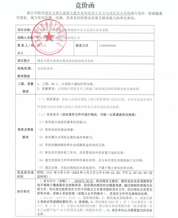 穆家及雅東麗都安置房裝飾裝修專業(yè)分包項(xiàng)目家具采購(gòu)競(jìng)價(jià)公告