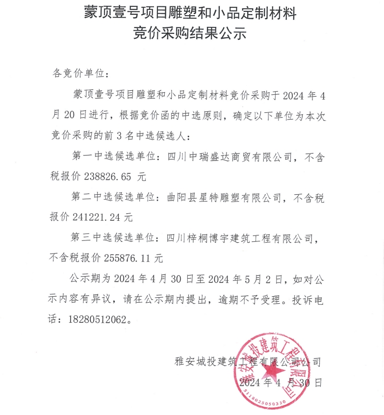 蒙頂壹號項目雕塑和小品定制材料競價采購結果公示