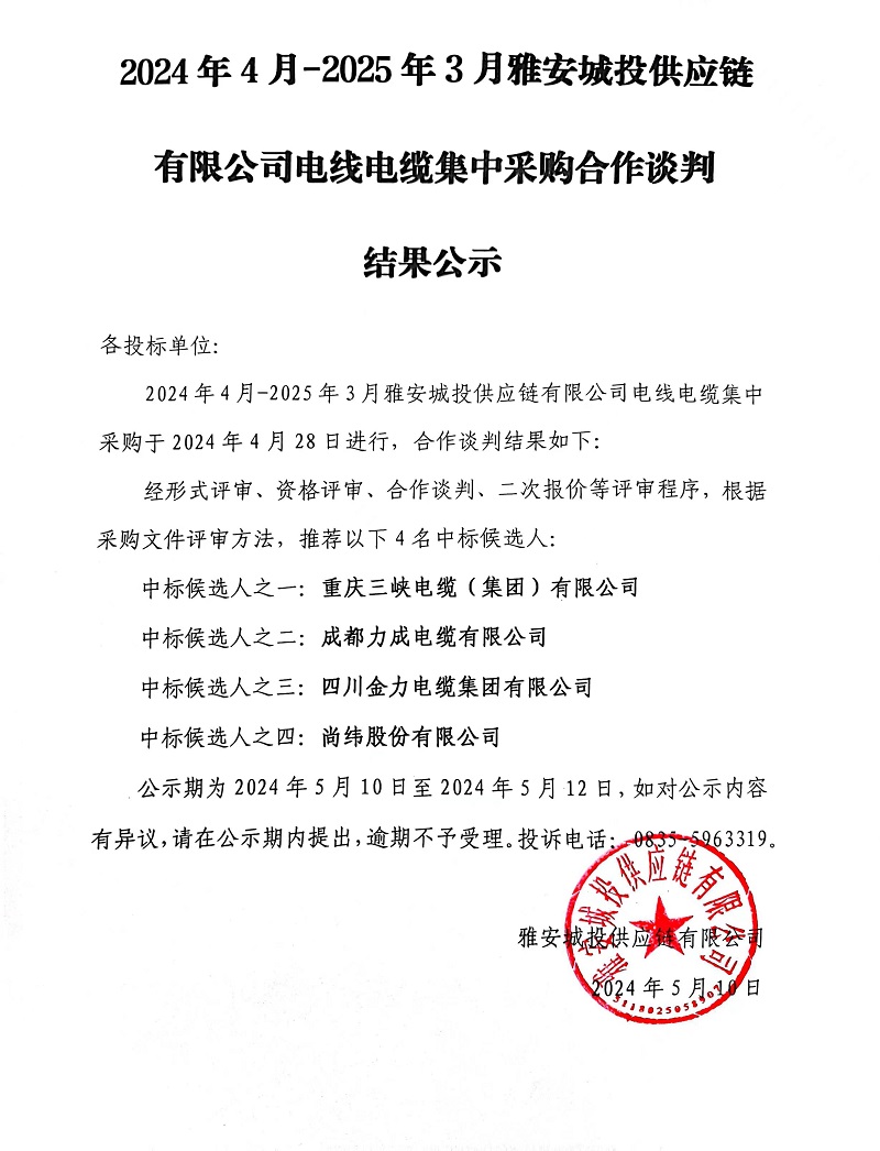 2024年4月-2025年3月雅安城投供應鏈有限公司電線電纜集中采購合作談判結(jié)果公示