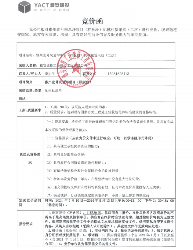 雅州壹號(hào)院總坪項(xiàng)目(樣板段)機(jī)械租賃采購(二次)競(jìng)價(jià)公告