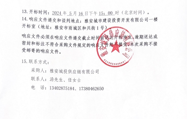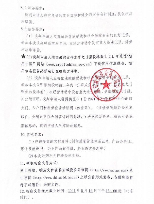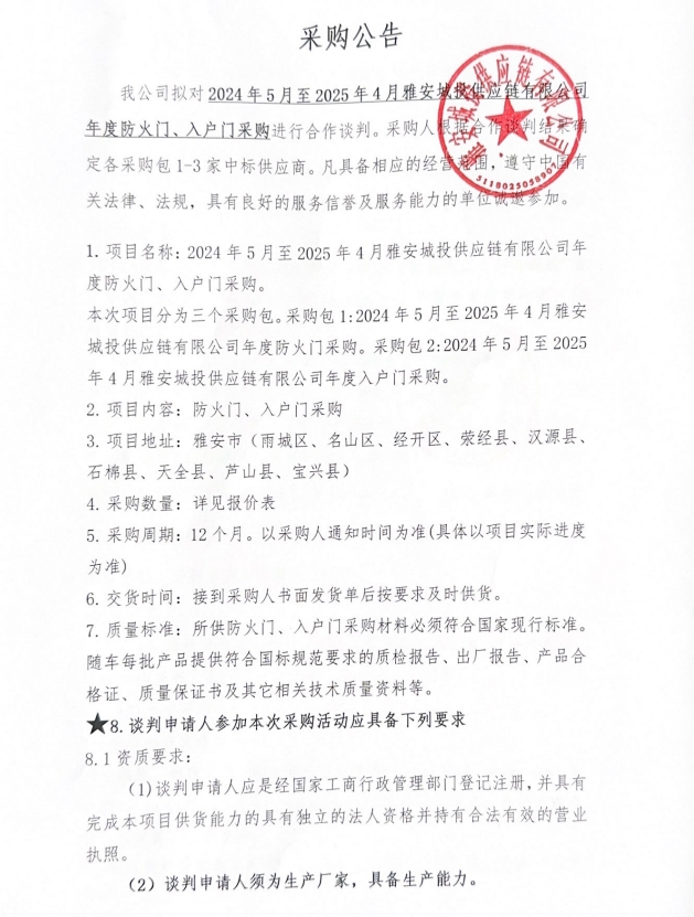 2024年5月至2025年4月雅安城投供應鏈有限公司年度防火門、入戶門采購公告