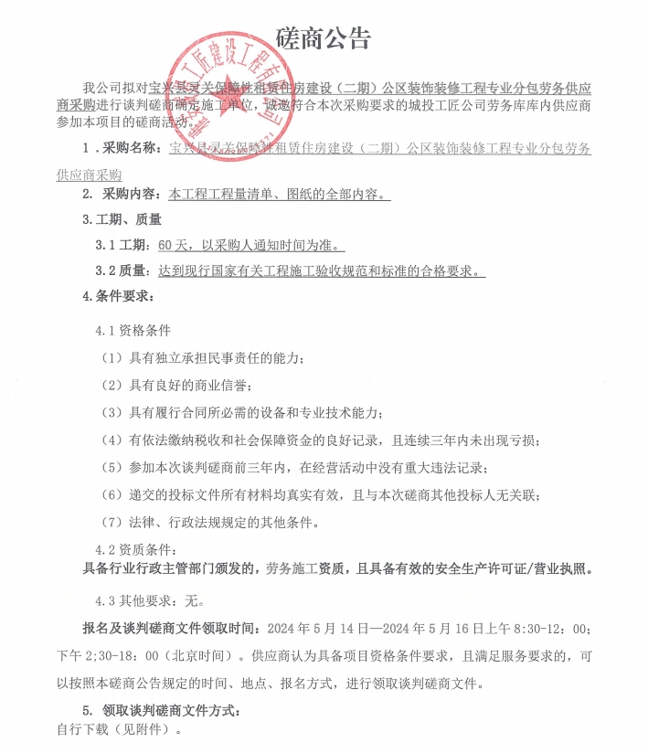 寶興縣靈關(guān)保障性租賃住房建設(shè)(二期)公區(qū)裝飾裝修工程專(zhuān)業(yè)分包勞務(wù)供應(yīng)商采購(gòu)談判磋商公告