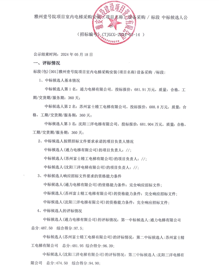 雅州壹號院項(xiàng)目室內(nèi)電梯采購安裝(項(xiàng)目名稱)設(shè)備采購/標(biāo)段中標(biāo)候選人公示