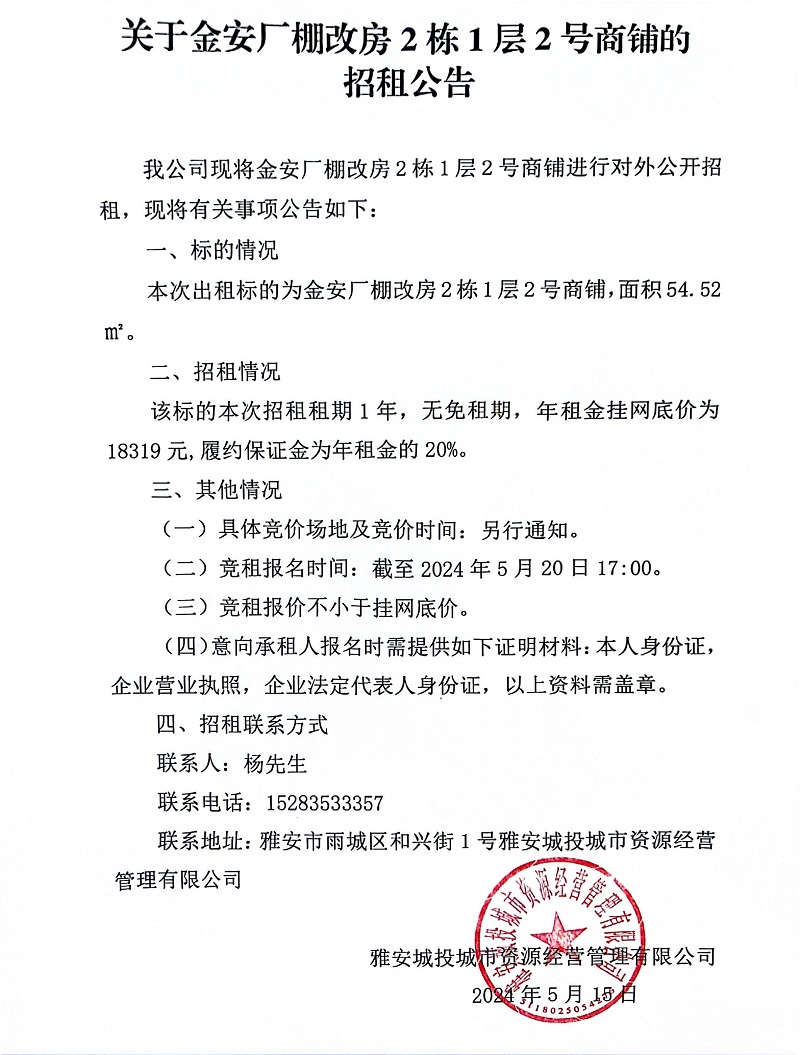 關(guān)于金安廠棚改房2棟1層2號(hào)商鋪的招租公告