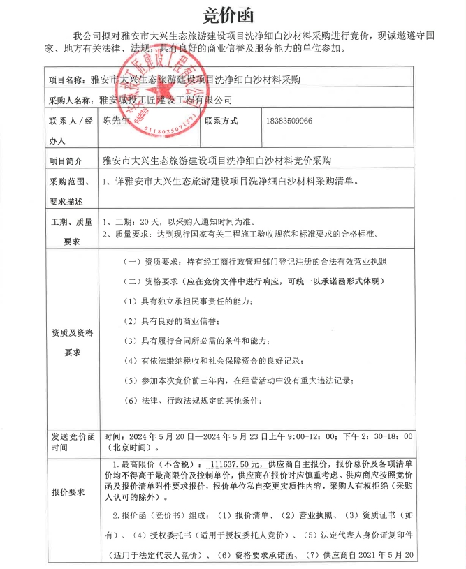 雅安市大興生態(tài)旅游建設(shè)項目洗凈細白沙材料采購競價公告