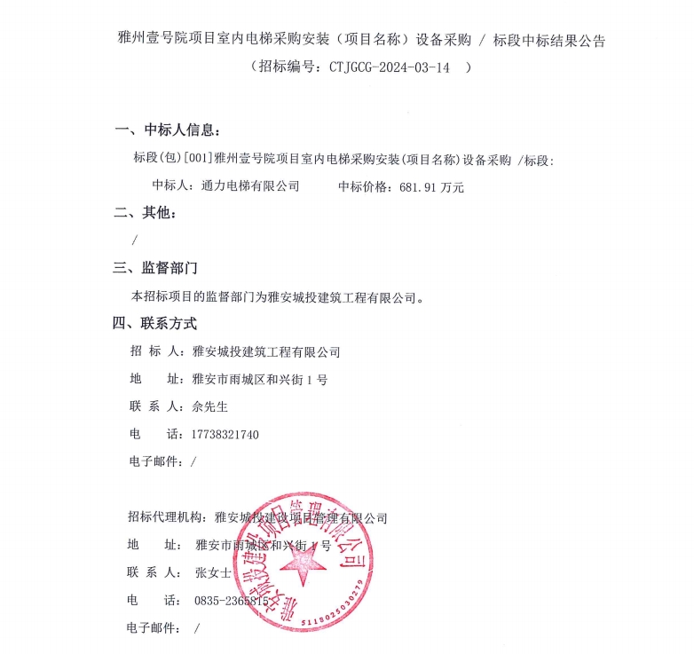 雅州壹號院項目室內(nèi)電梯采購安裝(項目名稱)設(shè)備采購/標段中標結(jié)果公告