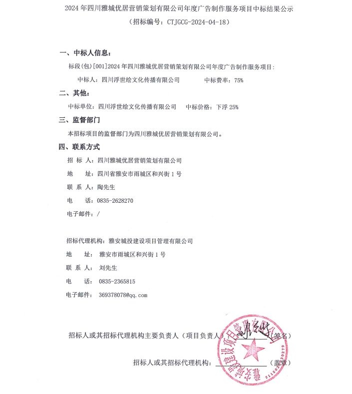2024年四川雅城優(yōu)居營銷策劃有限公司年度廣告制作服務項目中標結(jié)果公示