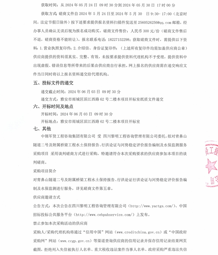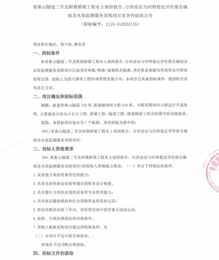 青鼻山隧道二號(hào)及附屬橋梁工程水土保持報(bào)告、行洪論證與河勢(shì)穩(wěn)定評(píng)價(jià)報(bào)告編制及水保監(jiān)測(cè)服務(wù)采購(gòu)項(xiàng)目競(jìng)爭(zhēng)性磋商公告