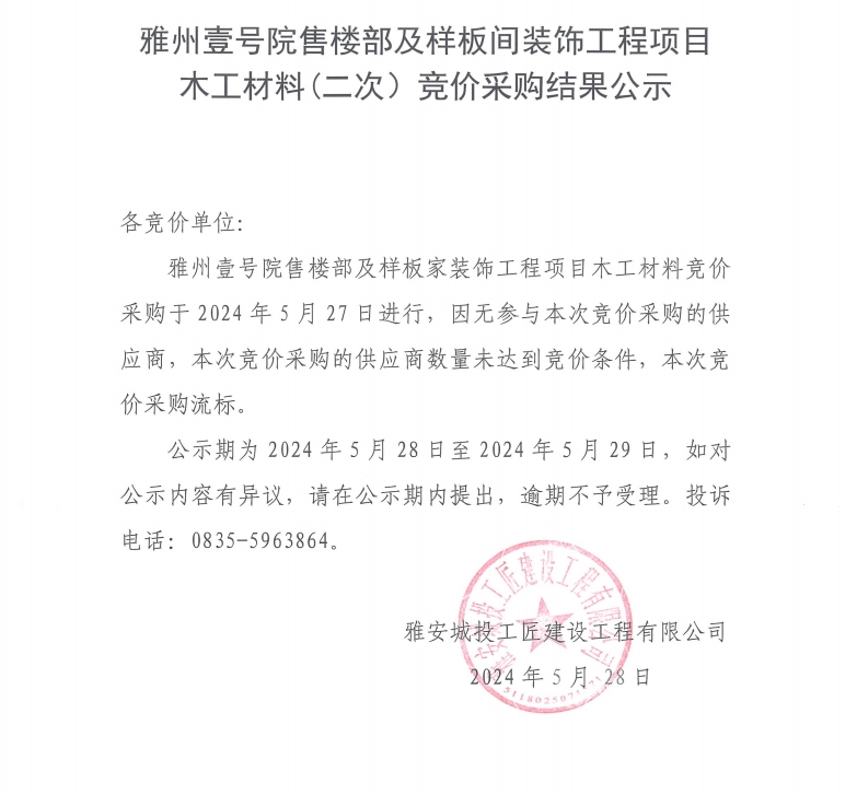 雅州壹號院售樓部及樣板間裝飾工程項目木工材料(二次)競價采購結(jié)果公示