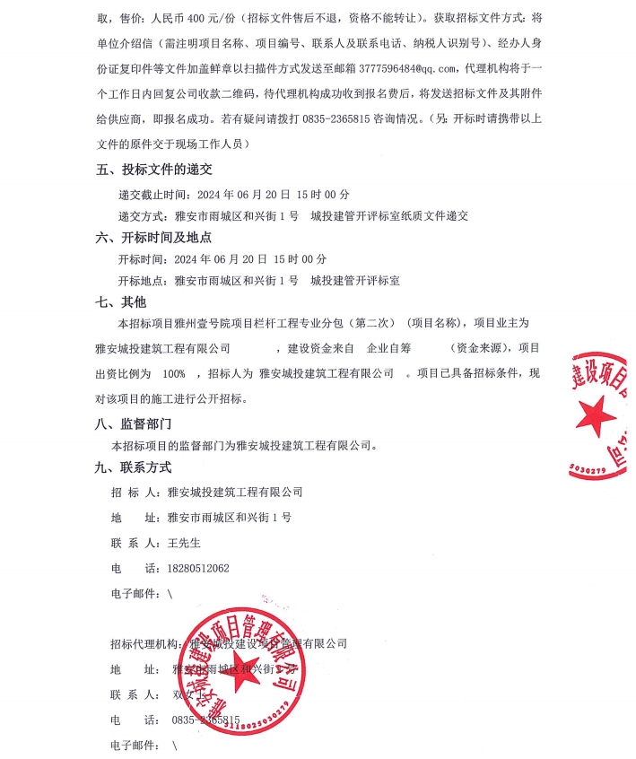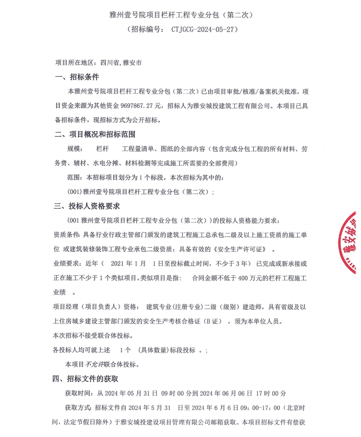 雅州壹號(hào)院項(xiàng)目欄桿工程專(zhuān)業(yè)分包(第二次)公告