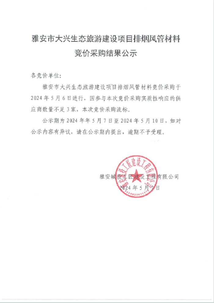 雅安市大興生態(tài)旅游建設(shè)項目排煙風(fēng)管材料競價采購結(jié)果公示