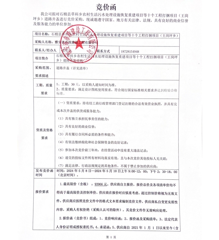 石棉縣草科鄉(xiāng)農(nóng)村生活污水處理設(shè)施恢復(fù)重建項(xiàng)目等十個(gè)工程打捆項(xiàng)目(王崗坪鄉(xiāng))道路井蓋競價(jià)公告