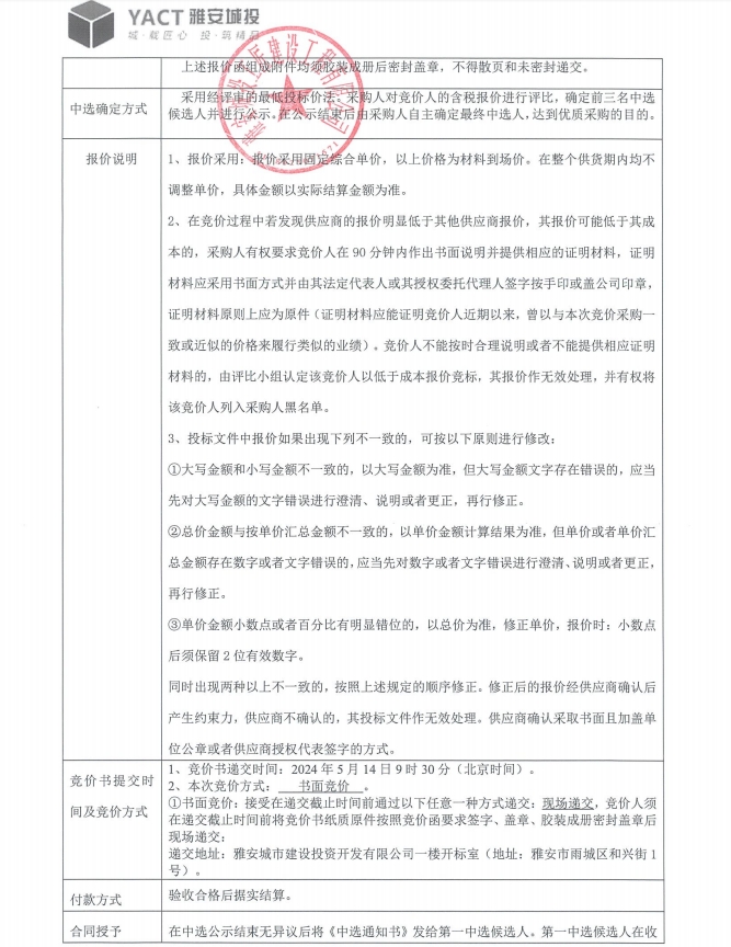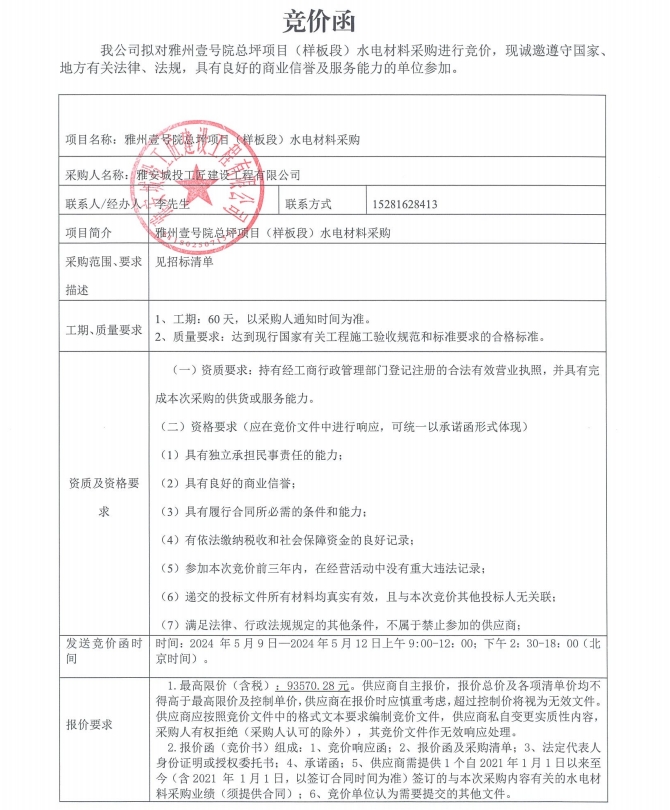 雅州壹號院總坪項目(樣板段)水電材料采購競價公告