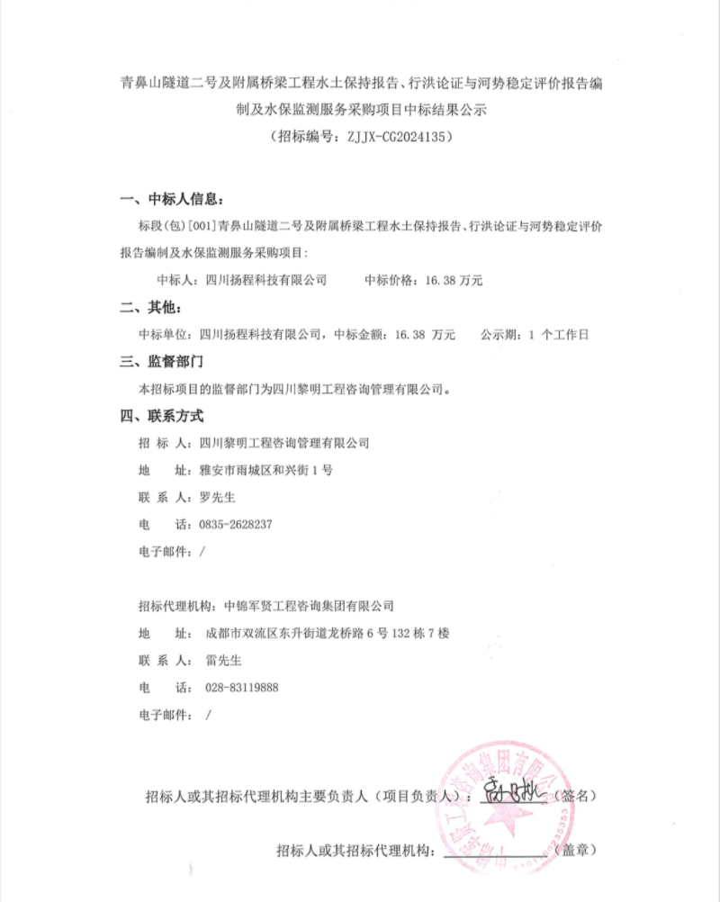 青鼻山隧道二號及附屬橋梁工程水土保持報告、行洪論證與河勢穩(wěn)定評價報告編制及水保監(jiān)測服務(wù)采購項目中標結(jié)果公示