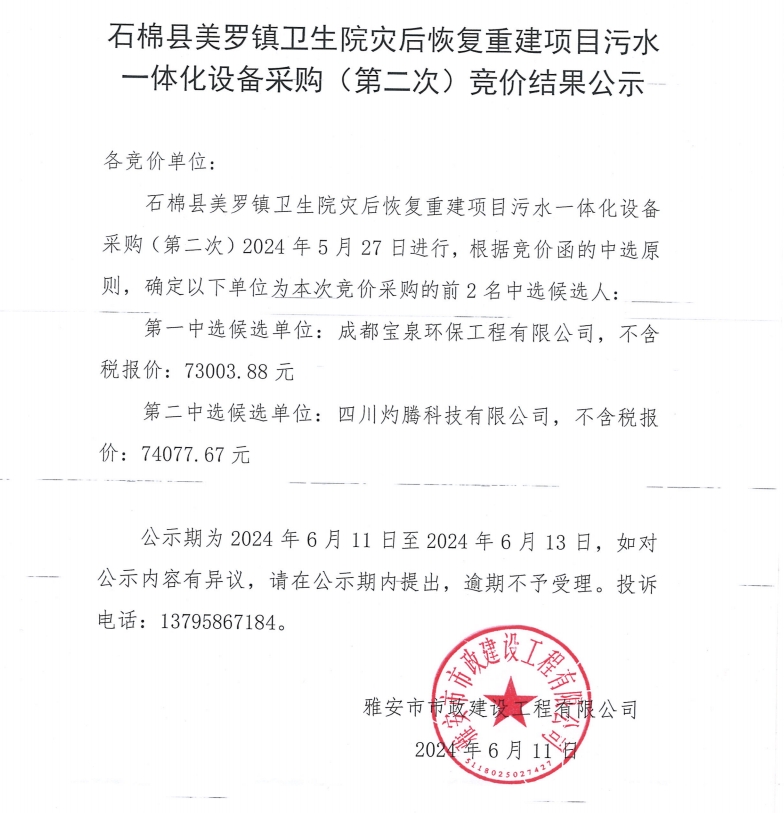 石棉縣美羅鎮(zhèn)衛(wèi)生院災(zāi)后恢復(fù)重建項目污水一體化設(shè)備材料采購(第二次)競價結(jié)果公示