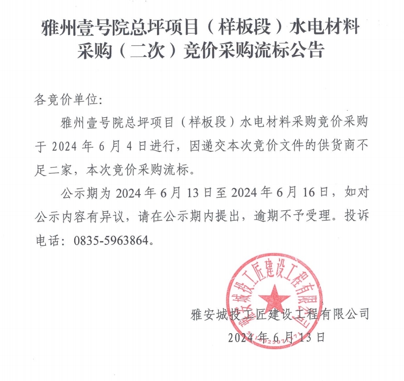 雅州壹號(hào)院總坪項(xiàng)目(樣板段)水電材料采購(二次)競(jìng)價(jià)采購流標(biāo)公告