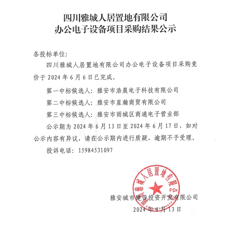 四川雅城人居置地有限公司辦公電子設(shè)備項(xiàng)目采購(gòu)結(jié)果公示
