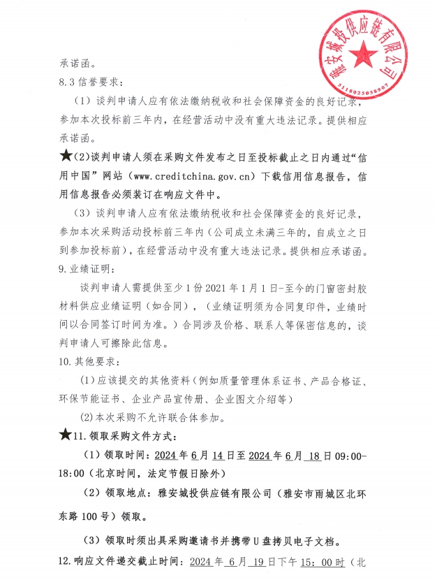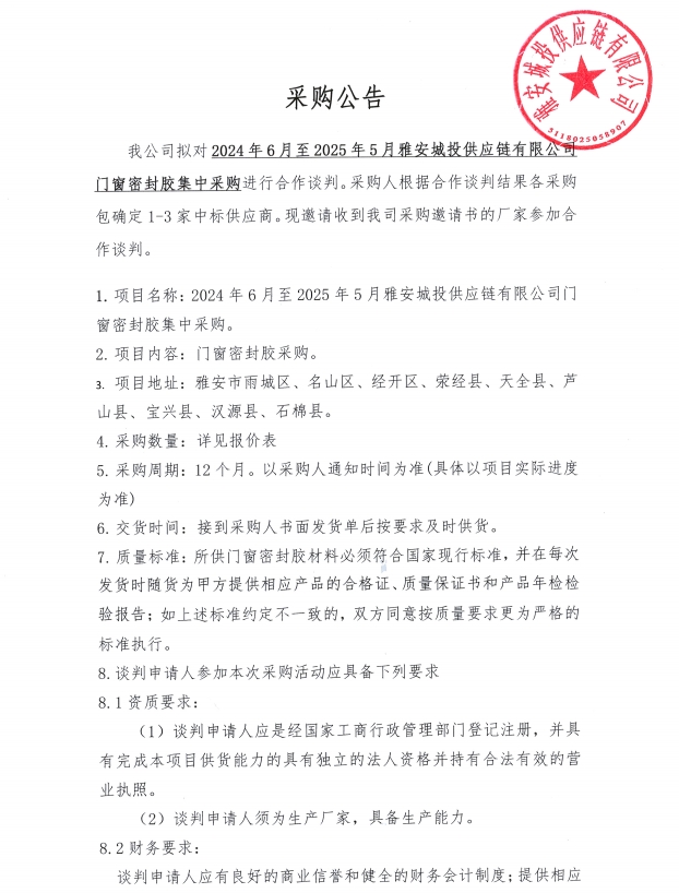 2024年6月至2025年5月雅安城投供應(yīng)鏈有限公司門窗密封膠集中采購公告