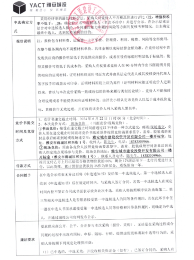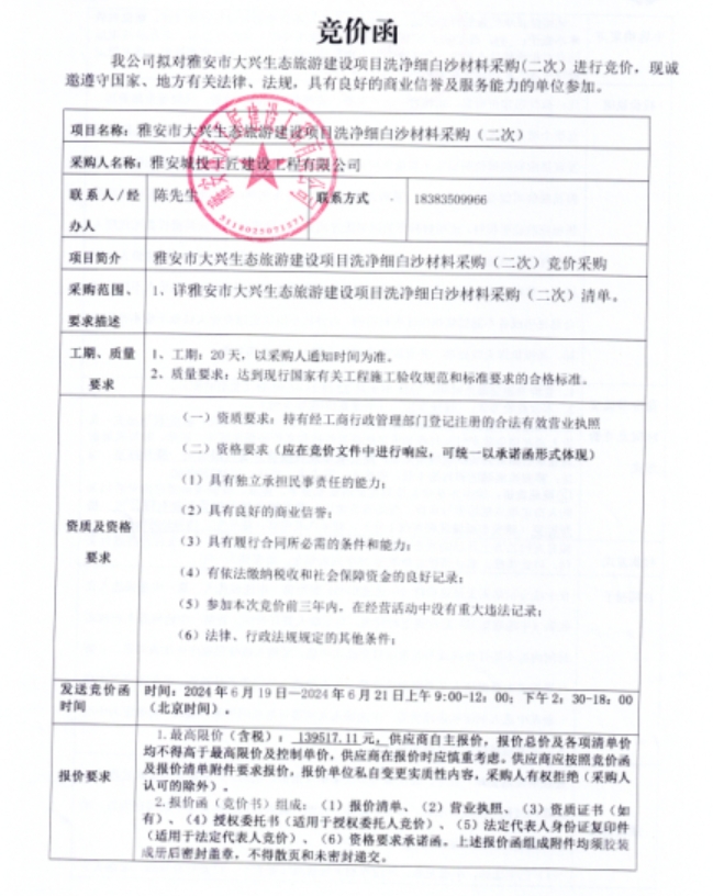 雅安市大興生態(tài)旅游建設(shè)項(xiàng)目洗凈細(xì)白沙材料采購(二次)競價(jià)公告