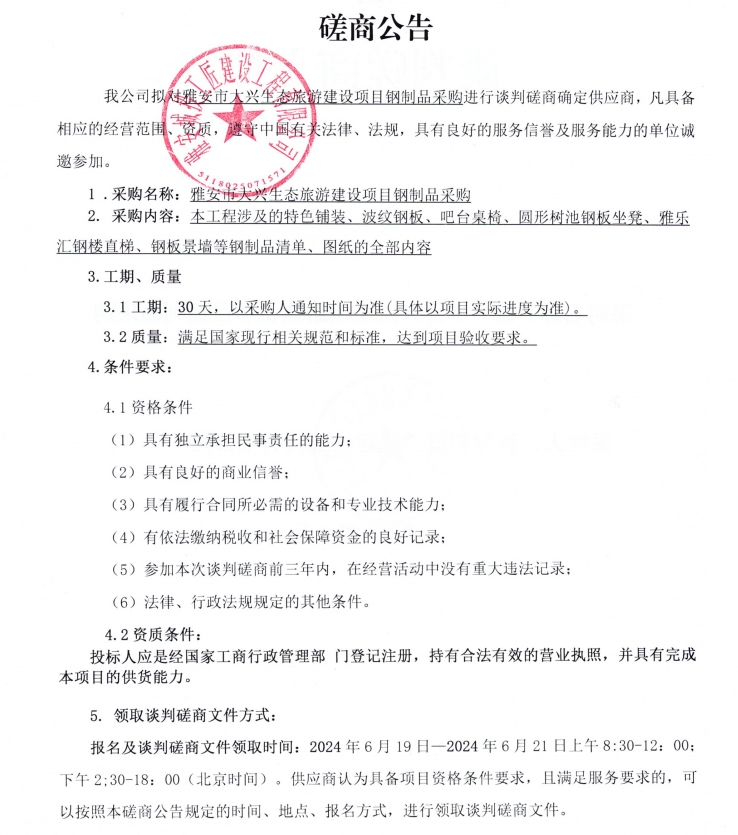 附件1:雅安市大興生態(tài)旅游建設(shè)項(xiàng)目鋼制品采購(gòu)磋商文件