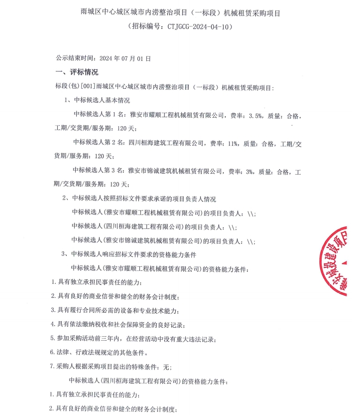 雨城區(qū)中心城區(qū)城市內(nèi)澇整治項(xiàng)目(一標(biāo)段)項(xiàng)目機(jī)械租賃采購項(xiàng)目公示
