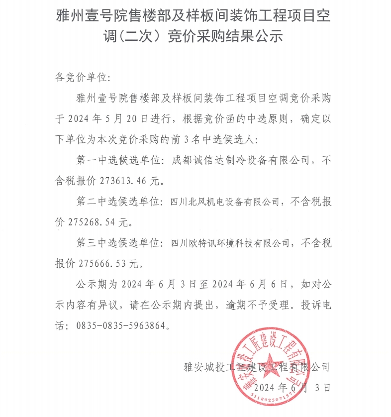 雅州壹號院售樓部及樣板間裝飾工程項目空調(diào)(二次)競價采購結(jié)果公示