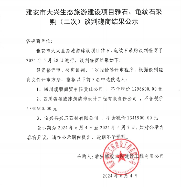 雅安市大興生態(tài)旅游建設項目雅石、龜紋石采購(二次)談判磋商結(jié)果公示