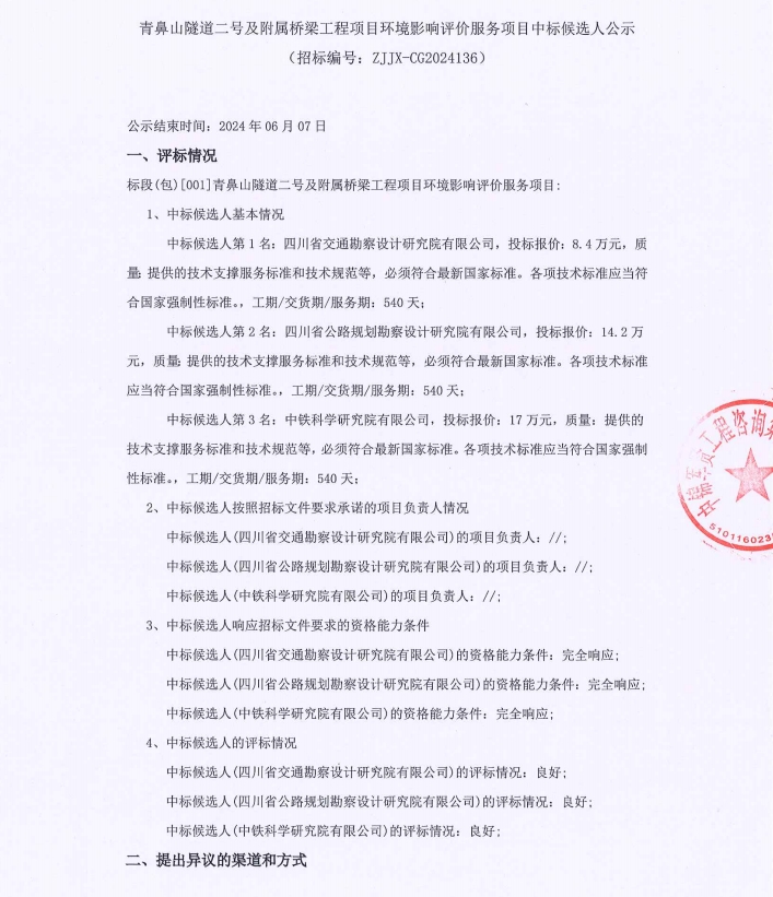 青鼻山隧道二號(hào)及附屬橋梁工程項(xiàng)目環(huán)境影響評(píng)價(jià)服務(wù)項(xiàng)目中標(biāo)候選人公示