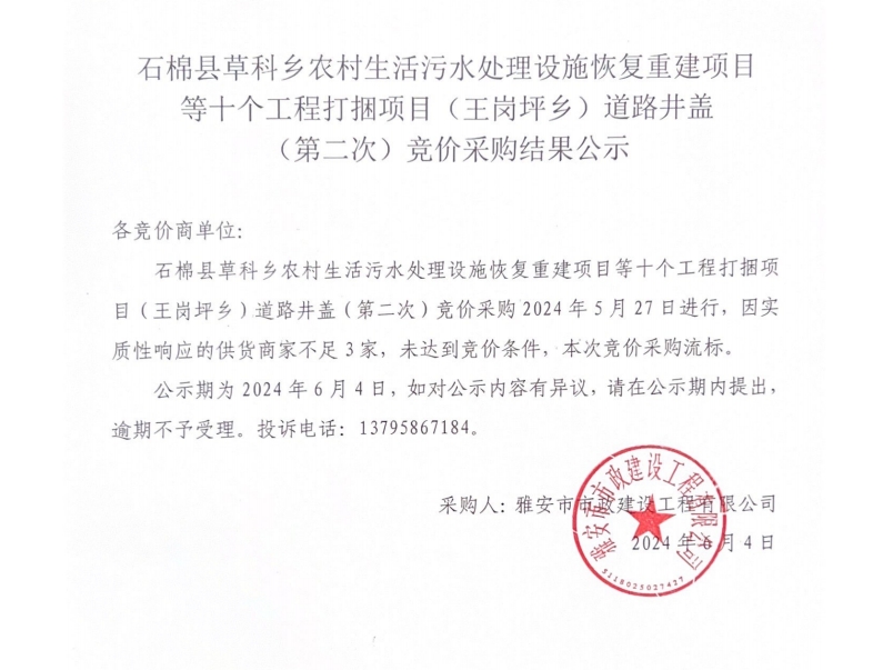石棉縣草科鄉(xiāng)農(nóng)村生活污水處理設(shè)施恢復(fù)重建項(xiàng)目等十個(gè)工程打捆項(xiàng)目(王崗坪鄉(xiāng))道路井蓋(第二次)競(jìng)價(jià)采購(gòu)結(jié)果公示