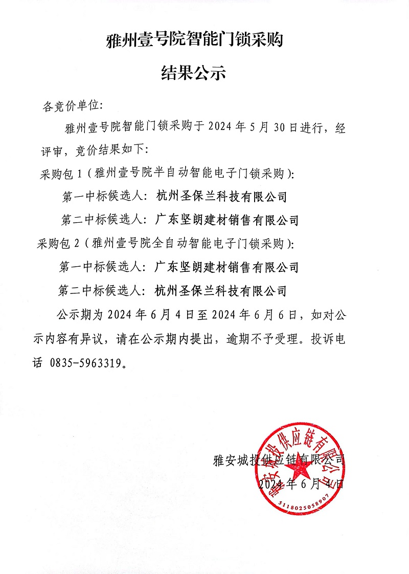 雅州壹號院智能門鎖采購結果公示