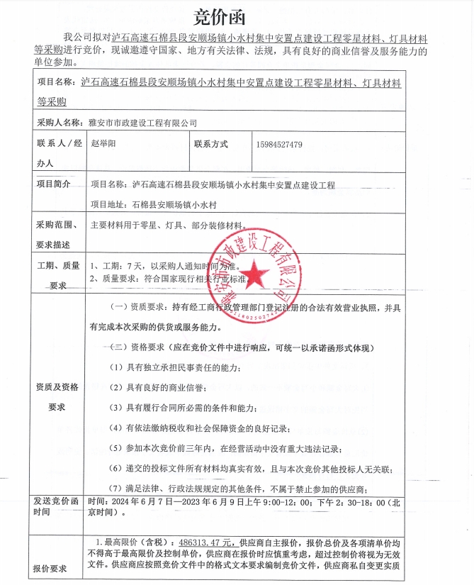 瀘石高速石棉縣段安順場鎮(zhèn)小水村集中安置點建設(shè)工程零星材料、燈具材料等采購競價公告