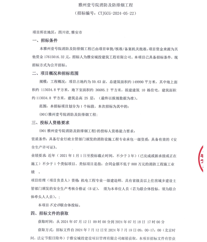 雅州壹號院項目消防及防排煙通風(fēng)工程公告