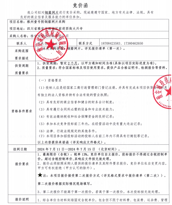競價函--雅州壹號院鋼筋網(wǎng)片采購