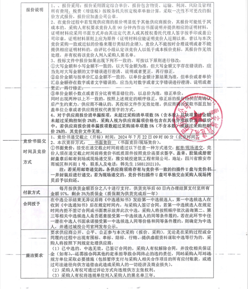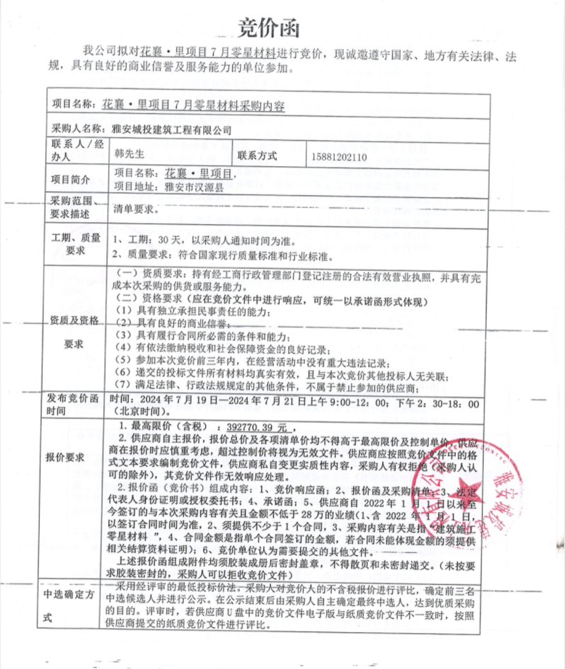 花襄·里項目7月零星材料采購競價公告