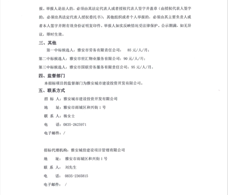 雅安城市建設(shè)投資開發(fā)有限公司及其下屬子公司人力資源外包服務(wù)項目中標(biāo)候選人公示