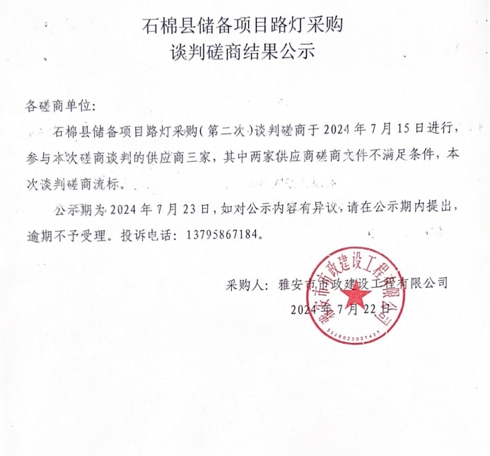 石棉縣儲備項目路燈采購談判磋商結(jié)果公示
