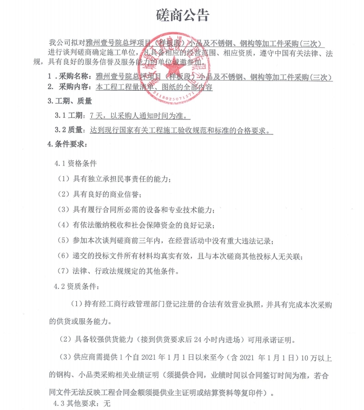 雅州壹號(hào)院總坪項(xiàng)目(樣板段)小品及不銹鋼、鋼構(gòu)等加工件的采購(gòu)(三次)磋商公告