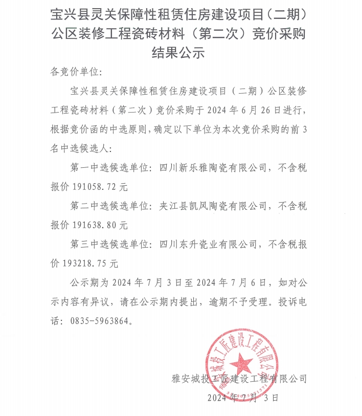 寶興縣靈關(guān)保障性租賃住房建設(shè)項(xiàng)目(二期)公區(qū)裝修工程瓷磚材料(第二次)競價(jià)采購結(jié)果公示)