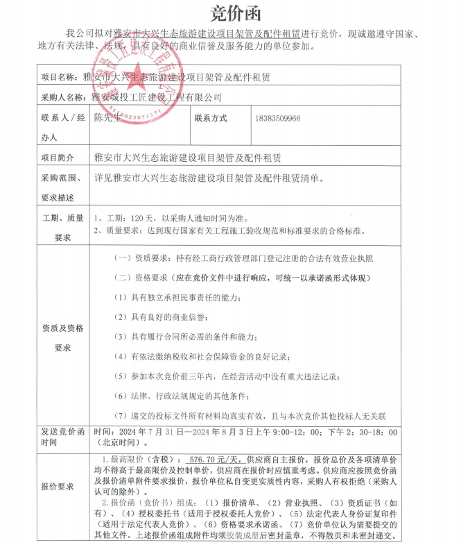 雅安市大興生態(tài)旅游建設(shè)項(xiàng)目架管及配件租賃競(jìng)價(jià)公告