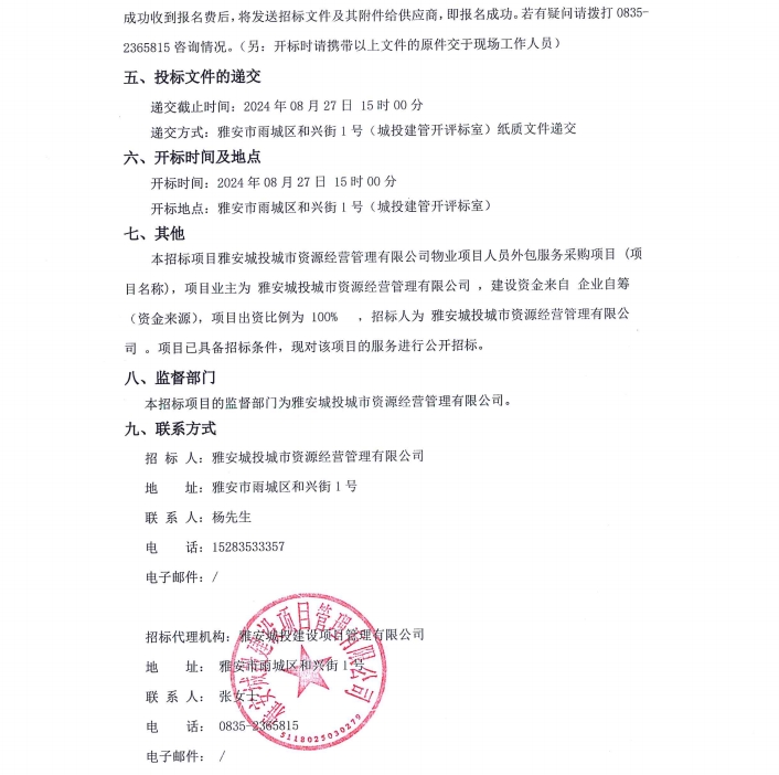 雅安城投城市資源經(jīng)營管理有限公司物業(yè)項(xiàng)目人員外包服務(wù)采購項(xiàng)目(項(xiàng)目名稱)服務(wù)/標(biāo)段公告
