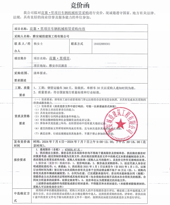 花襄·里項(xiàng)目車輛機(jī)械租賃采購競價公告