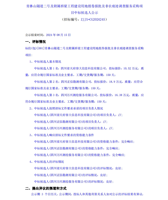 青鼻山隧道二號(hào)及附屬橋梁工程建設(shè)用地組卷報(bào)批及非農(nóng)痕跡調(diào)查服務(wù)采購(gòu)項(xiàng)目中標(biāo)候選人公示