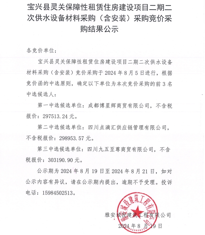 寶興縣靈關保障性租賃住房建設項目二期二次供水設備采購(含安裝)采購競價采購結果公示