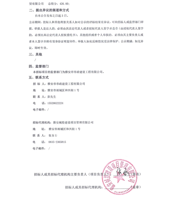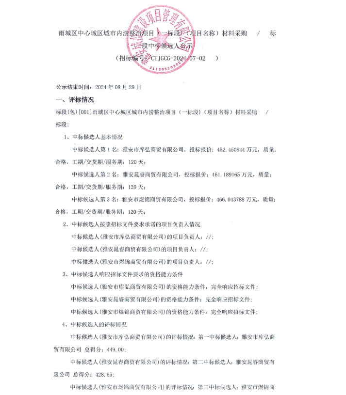 雨城區(qū)中心城區(qū)城市內(nèi)澇整治項(xiàng)目(一標(biāo)段)(項(xiàng)目名稱)材料采購/標(biāo)段中標(biāo)候選人公示