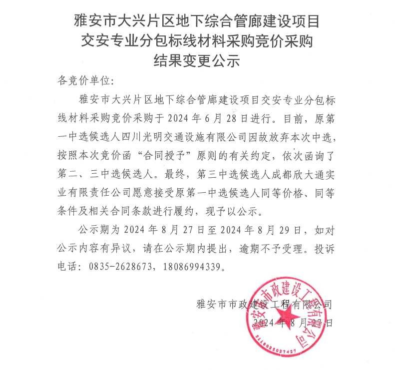 雅安市大興片區(qū)地下綜合管廊建設(shè)項目交安專業(yè)分包標線材料采購競價采購結(jié)果變更公示