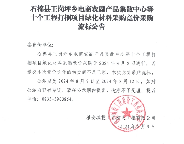 石棉縣王崗坪鄉(xiāng)電商農(nóng)副產(chǎn)品集散中心等十個(gè)工程打捆項(xiàng)目綠化材料采購競(jìng)價(jià)采購流標(biāo)公告