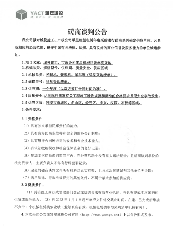 城投建工、市政公司零星機(jī)械租賃年度采購(gòu)磋商談判公告