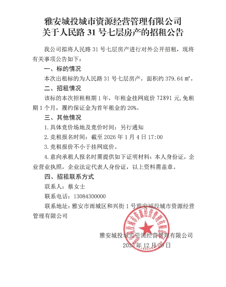 雅安城投城市資源經(jīng)營(yíng)管理有限公司關(guān)于人民路31號(hào)七層房產(chǎn)的招租公告