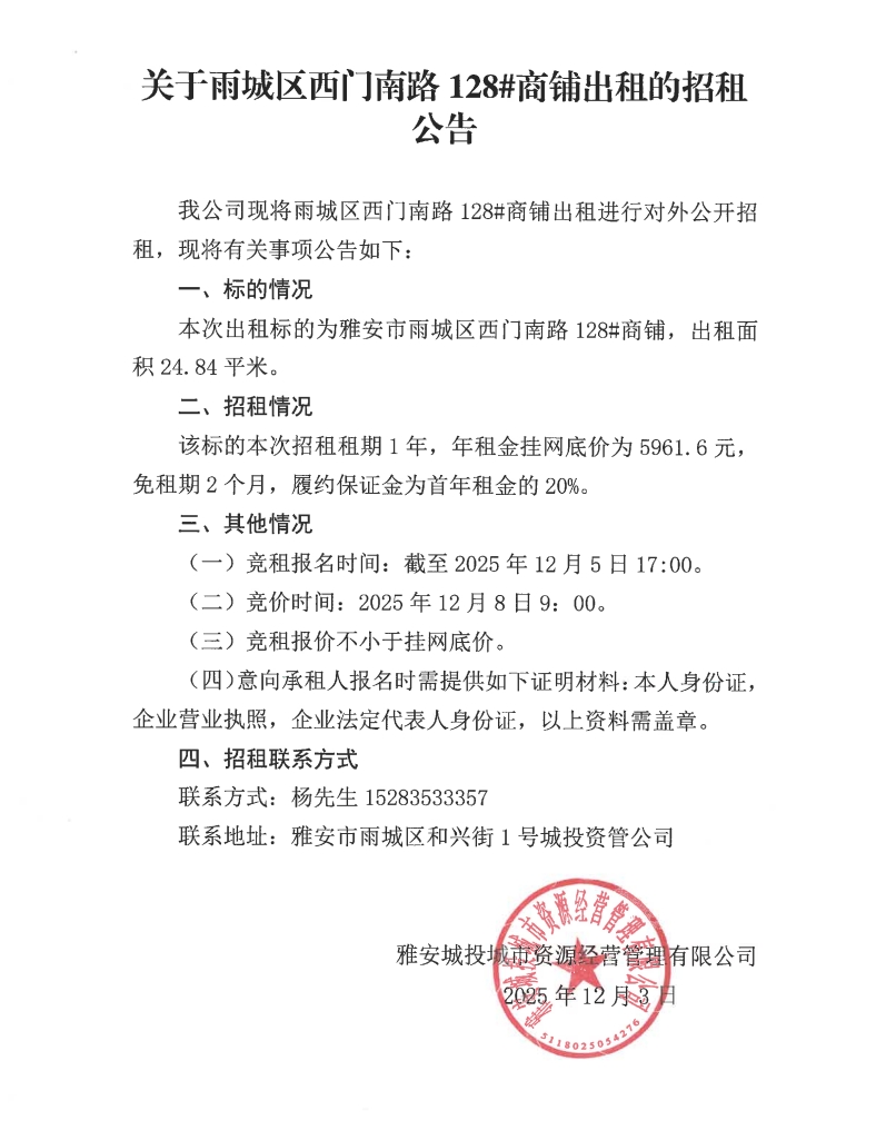 關(guān)于雨城區(qū)西門南路128#商鋪出租的招租公告