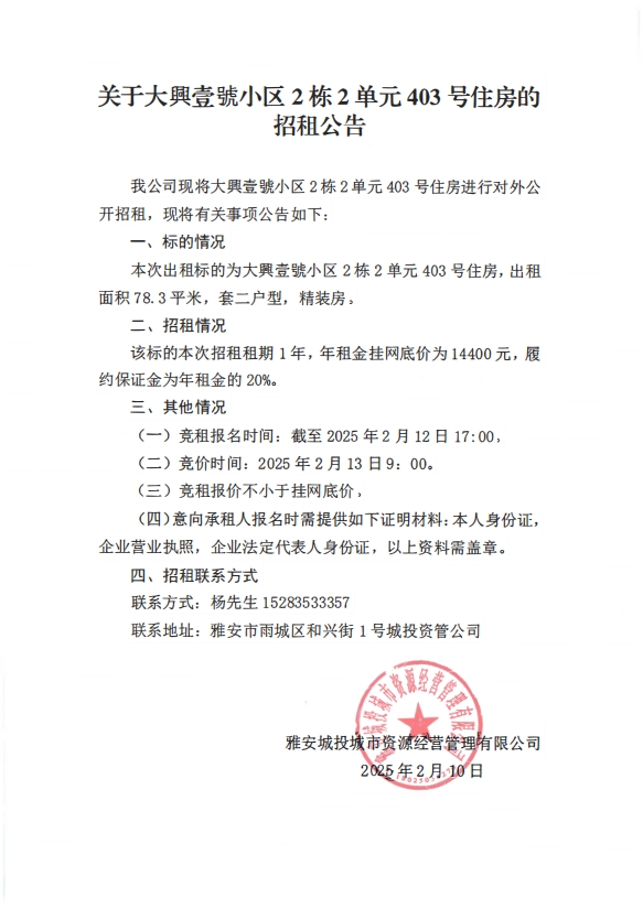 關(guān)于大興壹號(hào)小區(qū)2棟2單元403號(hào)住房的招租公告